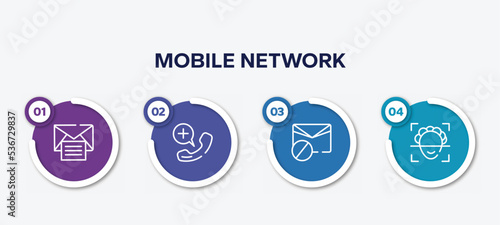 infographic element template with mobile network outline icons such as open mail, emergency call, spam, face scan vector.