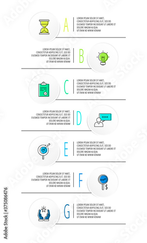 Infographics circles with 7 steps, icons. Flat line vector template. Can be used for seven business, web, workflow layout, flowchart, info graph, chart, processes diagram. Data visualization.