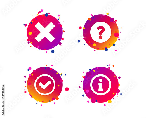 Information icons. Delete and question FAQ mark signs. Approved check mark symbol. Gradient circle buttons with icons. Random dots design. Vector