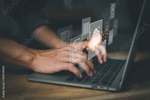 Information management technology, document management, cloud applications, backups, meeting reports, knowledge warehousing, database system. Man using computer search the Internet for information.
