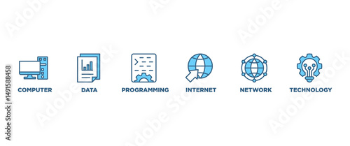 Information technology banner web icon set vector illustration concept with icon of computer, data, programming, database, internet, network, and technology icons symbol background