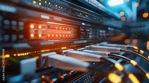 Information Technology Computer Network with Ethernet cables connected to an internet switch in a data center, emphasizing connectivity and data transmission