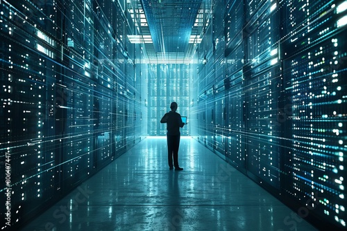 Information Technology person working in a large data center with laptop , Big Data Center , Activates Servers, Information Digitalization Starts. SAAS , Cloud Computing, Web Service