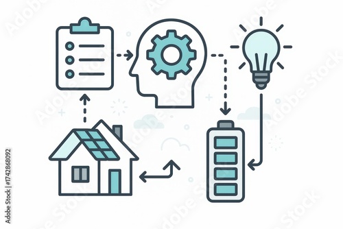 Innovative energy management illustration depicting integration of renewable resources into smart homes featuring battery storage system and actionable insights for sustainable living