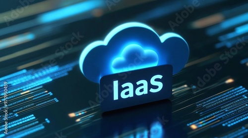 Innovative IaaS cloud computing concept with glowing blue elements on a dark background, showcasing modern technology.