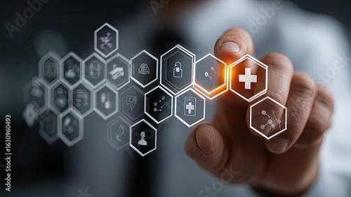 Innovative scientist interacts with futuristic medical data interface, exploring advanced healthcare technology and scientific discovery pathways.