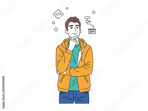 Innovative Solution Visualization: A thoughtful individual contemplates innovative solutions, ideas swirling around him.