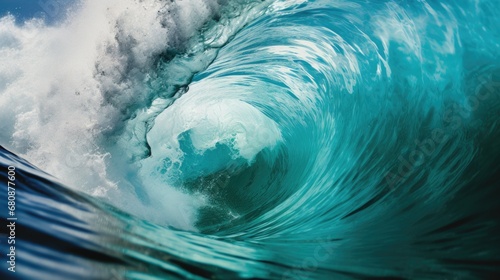 Inside view of a dynamic, foamy ocean wave