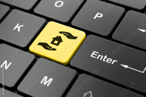 Insurance concept: computer keyboard with House And Palm icon on enter button background, 3D rendering