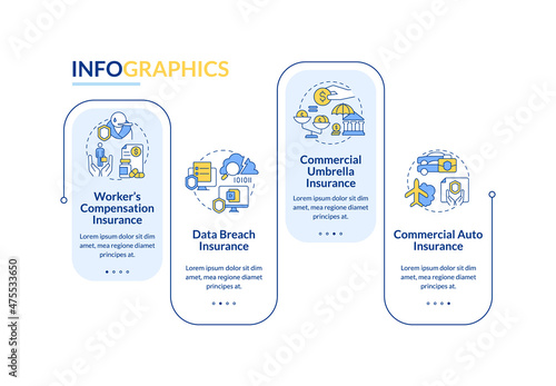 Insurance types rectangle infographic template. Safety claim. Data visualization with 4 steps. Process timeline info chart. Workflow layout with line icons. Lato-Bold, Lato-Regular fonts used