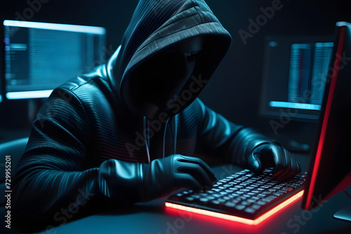 Intense young male hacker in dark room with backlit keyboard and multiple monitors