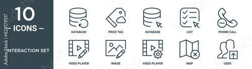 interaction set outline icon set includes thin line database, price tag, database, list, phone call, video player, image icons for report, presentation, diagram, web design