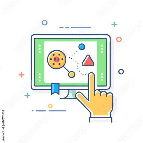 Interactive Data Visualization on Digital Screen A User is Pointing at a Complex Network Diagram Showing Interconnected Nodes and Shapes