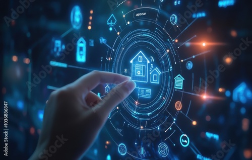 Interactive smart home technology interface with a hand engaging with futuristic display, showcasing innovative control options