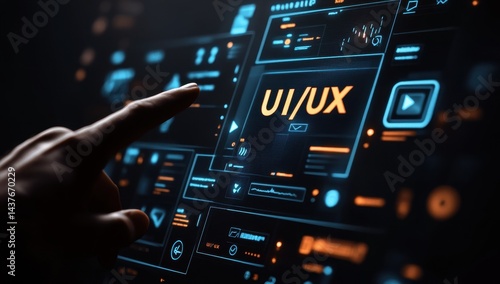 Interactive user interface design. A hand interacts with a digital display showcasing UI/UX elements. Detailed graphic interface with various elements
