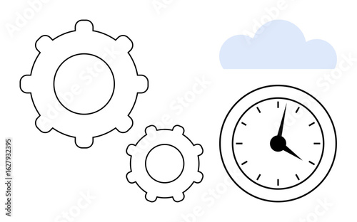 Interconnected gears, analog clock, and cloud element depict time management, cloud computing, teamwork, efficiency, innovation, workflow, and optimization in a simple flat metaphor