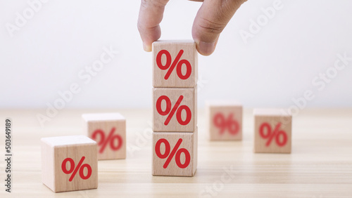 Interest rate financial and mortgage rates concept. Hand putting wood cube block increasing on top with icon percentage symbol upward direction