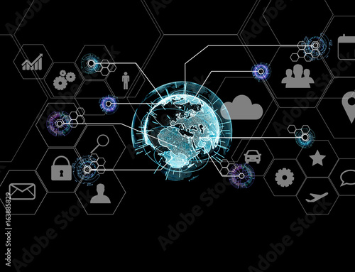 International business network connection displayed on a futuristic interface with technology icon and sphere globe - Worldwide business concept