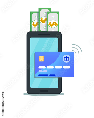 Internet banking concept. Flat design of online mobile payment via credit card with nfc technology. Secure shopping wireless pay transaction through smartphone isolated on white background.