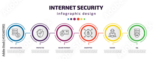 internet security infographic template with icons and 6 step or option. internet security icons such as data unclocked, protected, secure payment, encrypted, hacker, sql vector. can be used for
