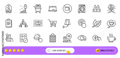 Internet shopping, Portable computer and Waterproof line icons for web app. Pack of Bitcoin graph, Teamwork, Music phone pictogram icons. Bitcoin project, Wallet, Petrol station signs. Vector