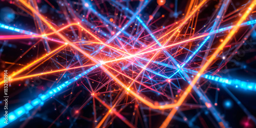 Intersecting neon lines forming complex data networks, minimal abstract illustration technology wallpaper background.
