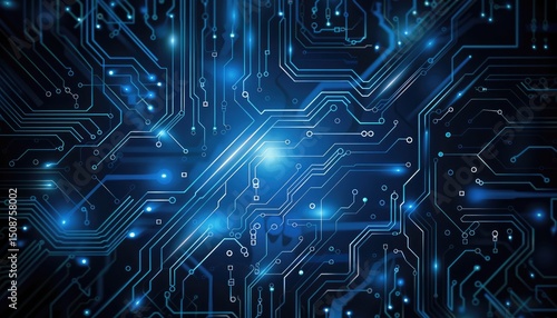 Intricate circuit board design with glowing blue lines.