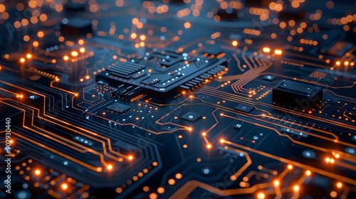 Intricate Circuit Board with Glowing Connections and Microchips