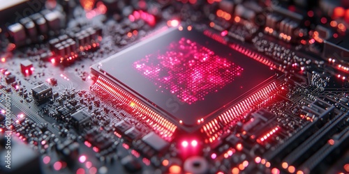 Intricate details of a circuit board showcasing vibrant red lighting and a central microprocessor during a technological display