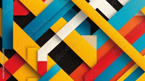 Intricate geometric pattern in bold colors, interwoven with abstract shapes, creating a visually dynamic background