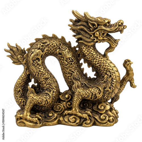 Intricate golden dragon sculpture, a realistic mythical beast on Transparent Background