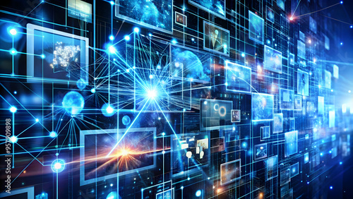 Intricate web of screens showcasing various data, symbolizing the interconnectedness of the digital world. Dynamic network of screens connected by lines of light, representing