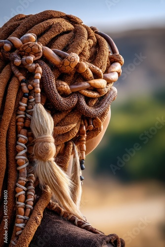 Intricately braided Himba hairstyle coated with red otjize clay