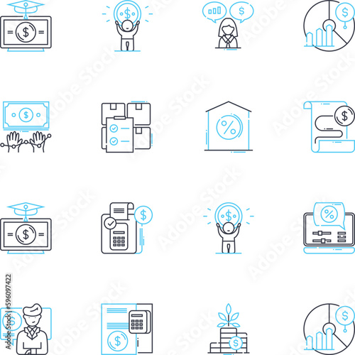 Investment strategy linear icons set. Diversification, Risk, Portfolio, Allocation, Asset, Returns, Yield line vector and concept signs. Trends,Volatility,Equities outline illustrations