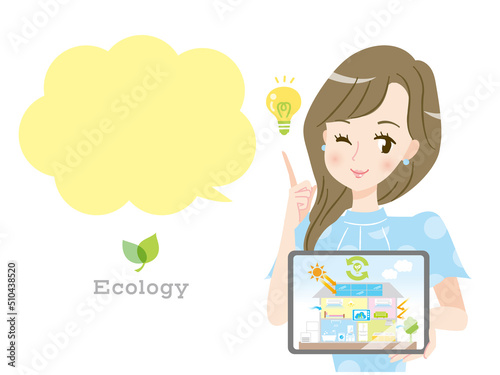 タブレットの画面を見せてIOTについて説明する女性と吹き出しのイラスト素材
