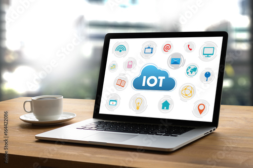IOT business man hand working and internet of things (IoT) word diagram as concept use Browsing Internet computer Searching Data Internet Marketing