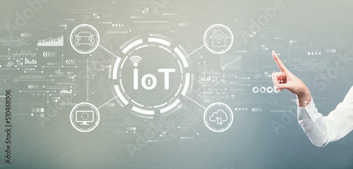 IoT theme with hand pressing a button on a gray background