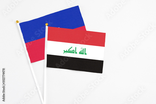Iraq and Haiti stick flags on white background. High quality fabric, miniature national flag. Peaceful global concept.White floor for copy space.