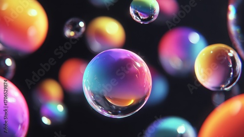Iridescent Soap Bubbles Floating in Dark Space, Rainbow Reflections, Abstract Art.