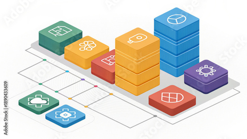 Isometric 3D diagram representing data storage and cloud services with abstract server icons and network connections.