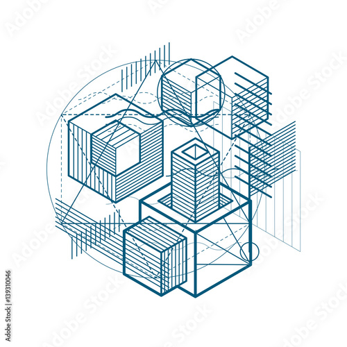 Isometric abstraction with lines and different elements, vector abstract background. Composition of cubes, hexagons, squares, rectangles and different abstract elements.