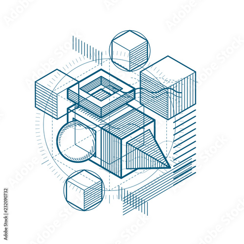 Isometric abstraction with lines and different elements, vector abstract background. Composition of cubes, hexagons, squares, rectangles and different abstract elements.