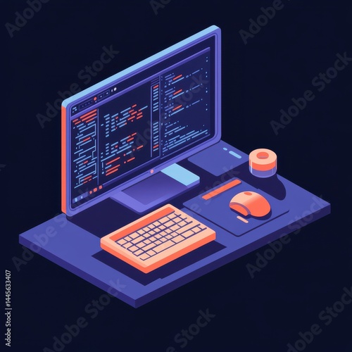 Isometric computer desk with monitor, keyboard, mouse, and office accessories for programming or coding.