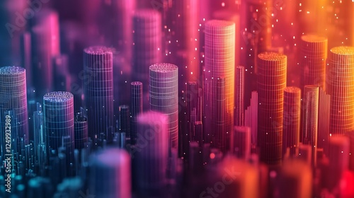 Isometric data visualization engaging bar graphs showcasing city buildings with lights and modern architecture elements