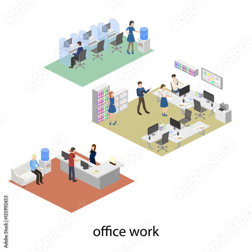 Isometric flat 3D concept vector design interior office set with workers and support hotline