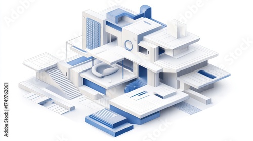 Isometric house illustration with white and blue colors for architectural design concept use