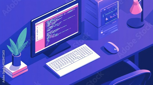 Isometric Illustration of a Computer Workstation with a Monitor, Keyboard, and Mouse