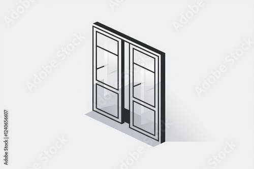 Isometric illustration of a pair of glass paneled doors, slightly ajar, showcasing modern design.