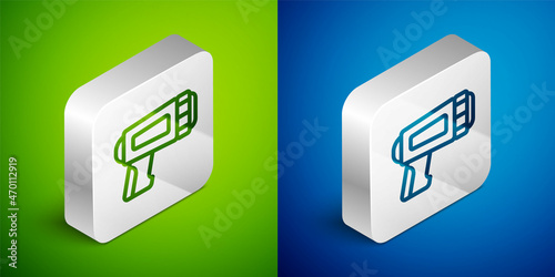 Isometric line Flashlight for diver icon isolated on green and blue background. Diving underwater equipment. Silver square button. Vector