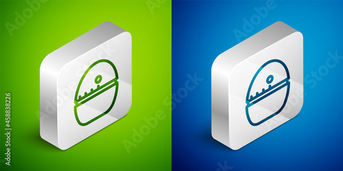 Isometric line Kitchen timer icon isolated on green and blue background. Egg timer. Cooking utensil. Silver square button. Vector